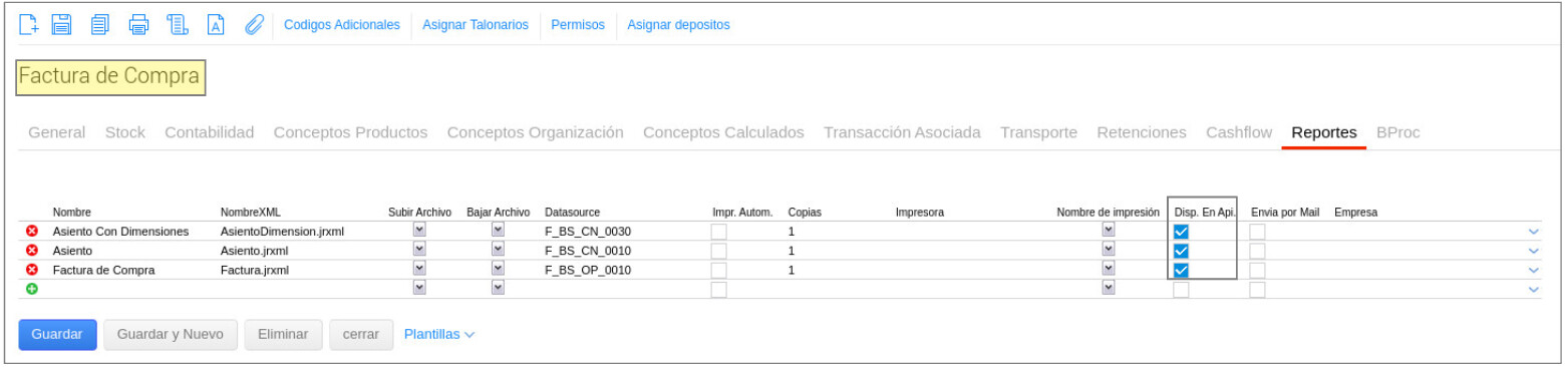 Para configurar ésto, deberás ingresar a la solapa de “Reportes” de cada tipo de documento, por ejemplo: Tipo Documento “Factura de compra > Reportes > Factura de compra” activar el check “Disp en api”. Ésto va a permitir recuperar los reportes asociados a la transacción.