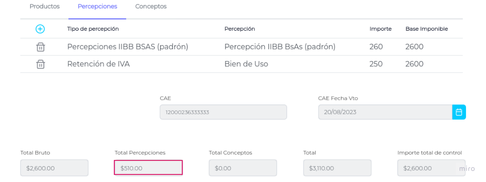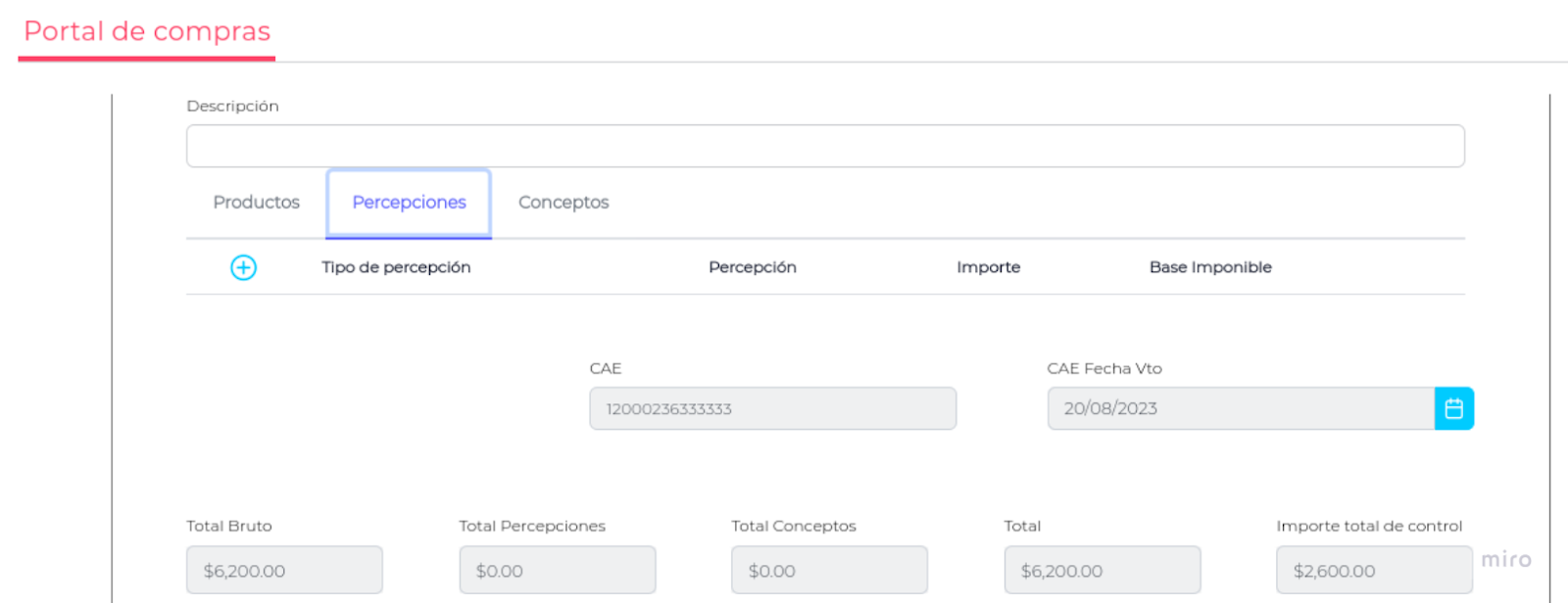 En la solapa con Percepciones, se podrán dar de alta presionando el botón +.