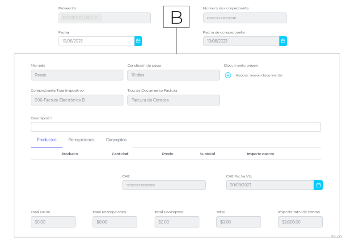 La misma posee datos no editables (gris), los cuales provienen de AFIP e ERP, como Proveedor, Número de Comprobante, Fecha del comprobante, Moneda, Condición de pago, Comprobante Tipo Impositivo y Tipo de Documento Factura.