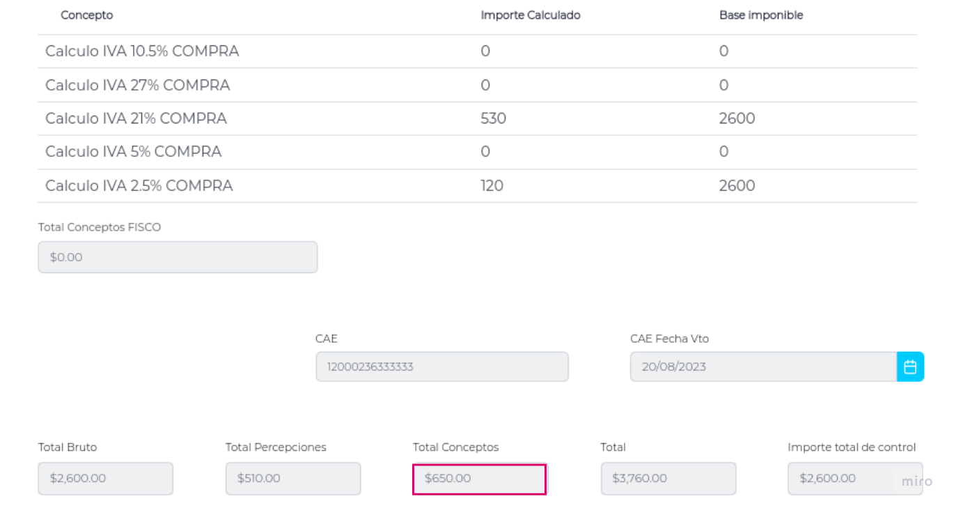 Completada toda la información, el sistema calculará el Total de Conceptos y los registrará en el campo con el mismo nombre situado en el margen inferior.