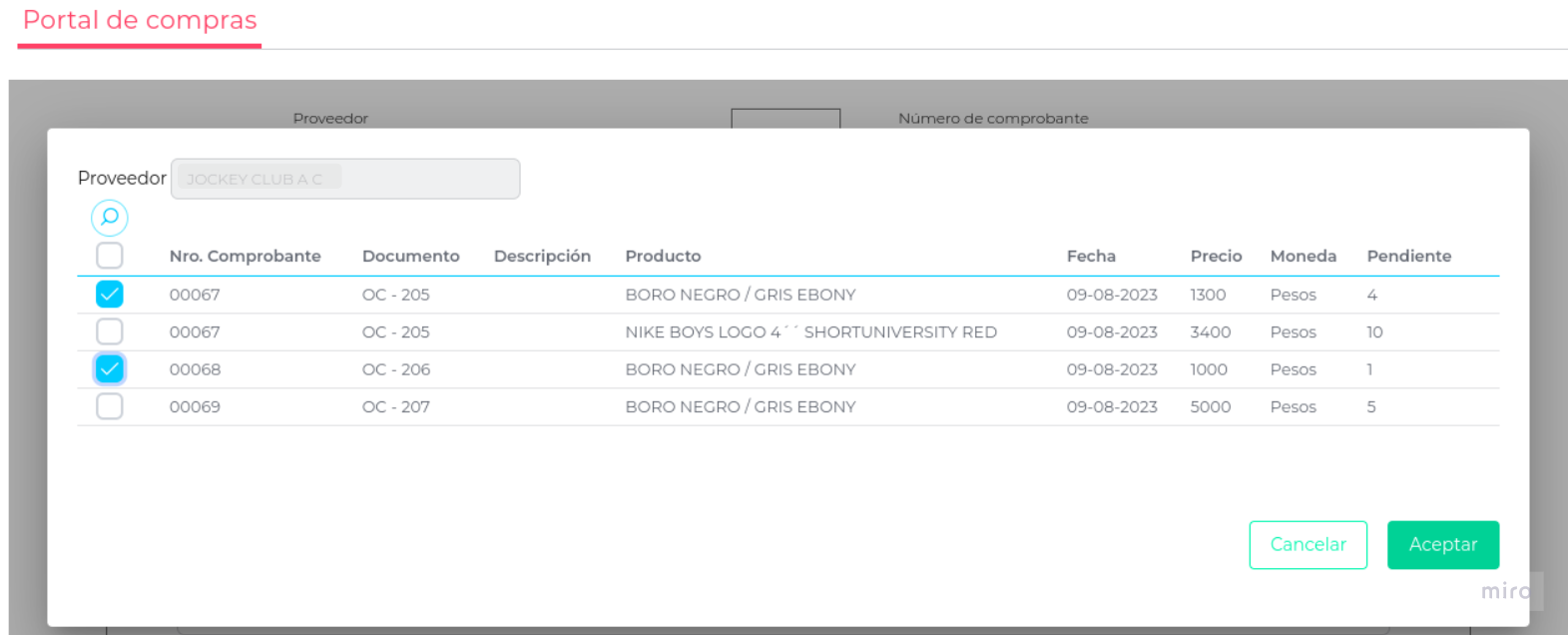 Presionando sobre éste, se desplegará una pantalla en la que se visualizarán los documentos que pueden ser vinculados a la factura que se está completando. Seleccionando los documentos, estará completando el detalle de la factura con los productos de los mismos.