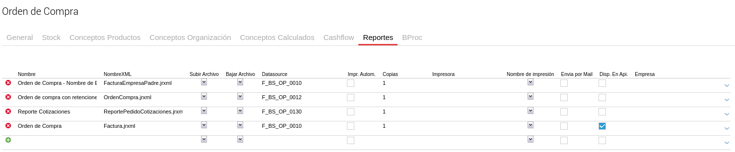 Para configurar ésto, deberás ingresar a la solapa de “Reportes” del tipo de documento: Tipo Documento “Orden de compra > Reportes > Orden de compra” activar el check “Disp en api”. Ésto va a permitir recuperar los reportes asociados a la transacción.