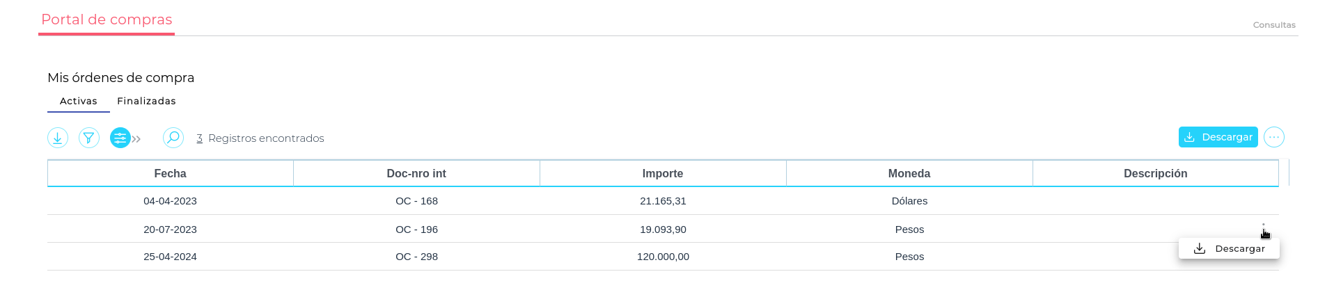 Desde este informe de Ordenes de compras, el Proveedor al posicionarse sobre un registro de interés, podrá acceder desde la derecha al botón Descargar.