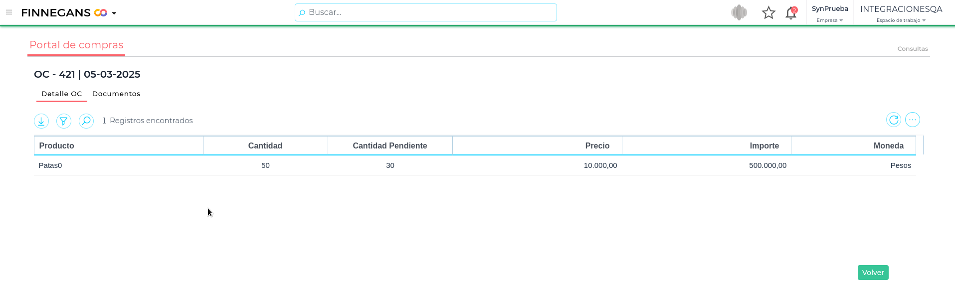 En esta pantalla visualizarás los productos que componen la OC, Cantidad, Cantidad pendiente, Precio, Importe y Moneda.