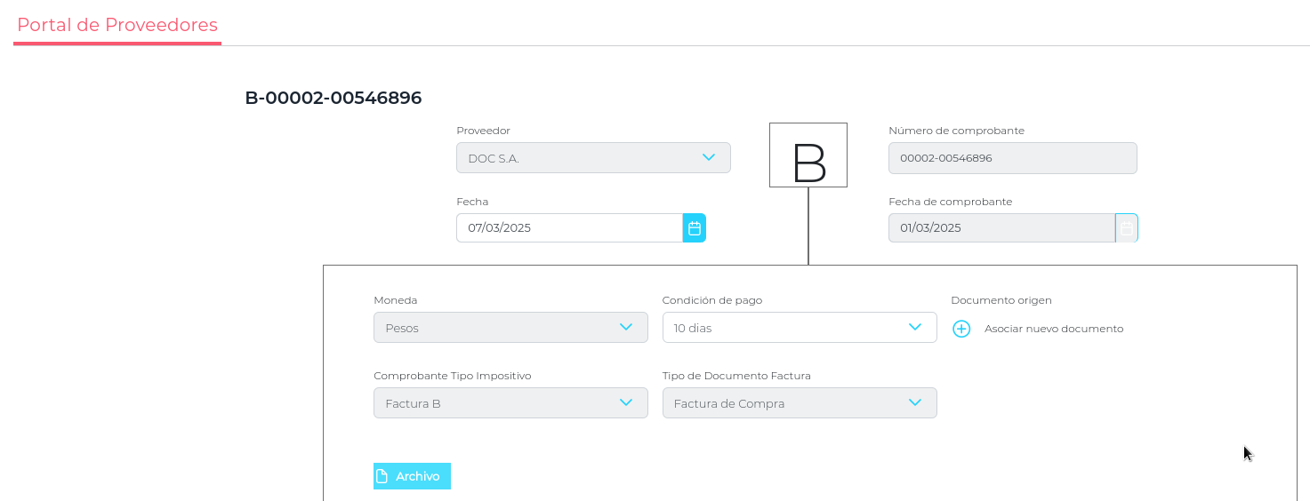 El portal permite a los proveedores cargar facturas de compra adjuntando documento respaldatorio, en base a información de AFIP precargada y documentos precargados en ERP (Órdenes de compra/recepciones). Además podrán ver el historial completo de facturas cargadas y su estado correspondiente, lo cual no solo mejora la transparencia, sino que también reduce las consultas en cuanto a sus actividades comerciales.