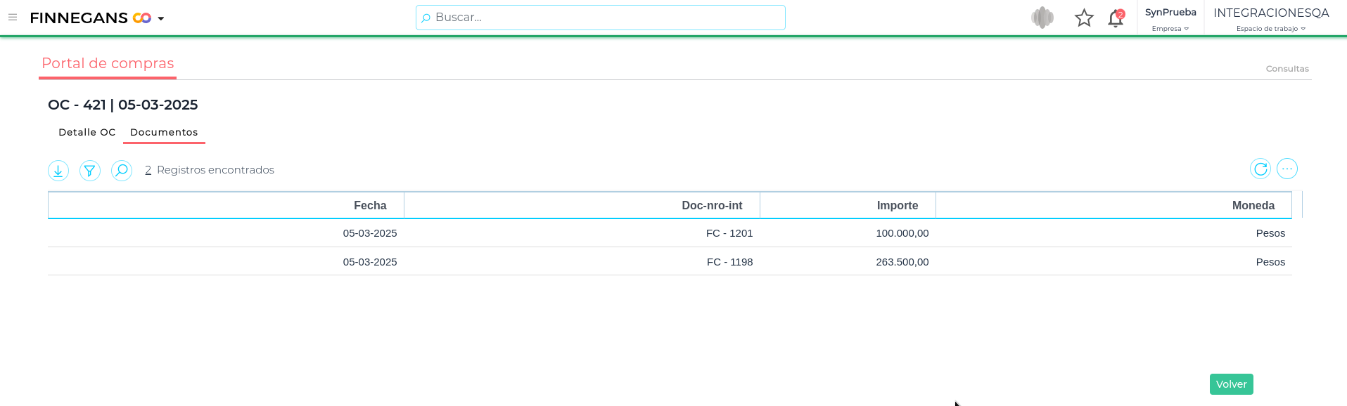 En esta pantalla visualizarás todos los documentos vinculados a la OC (según workflow) y su información relacionada como Fecha, Número de documento, Importe y Moneda.