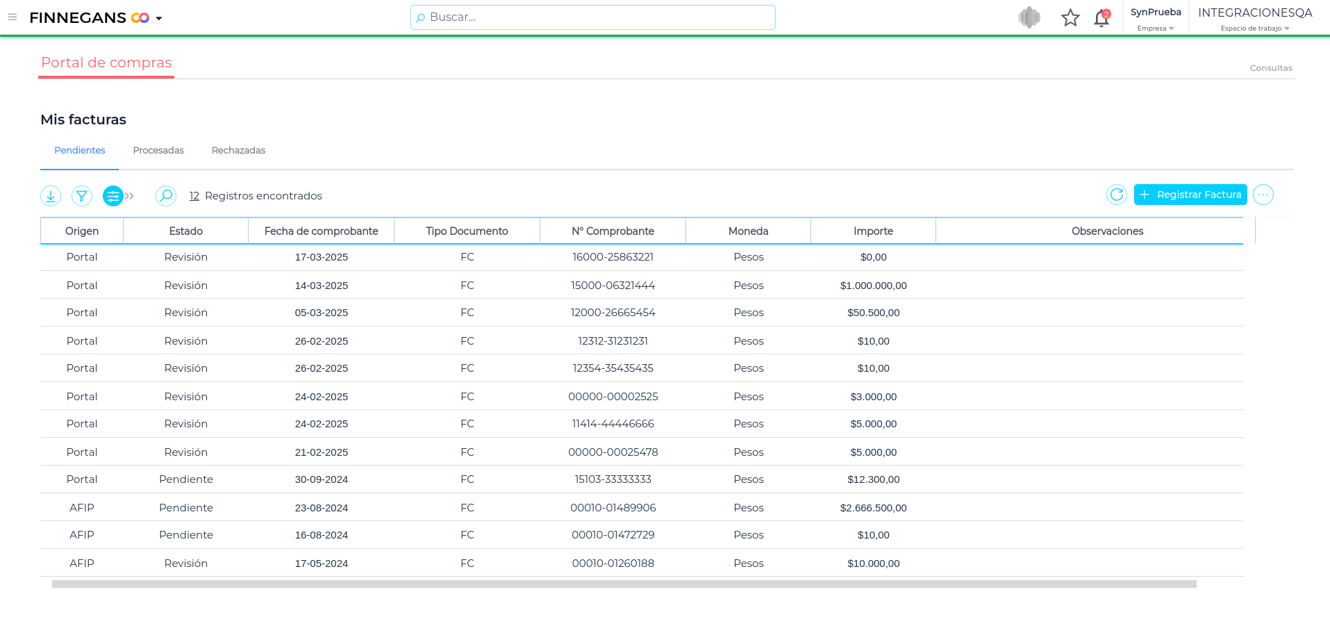 - Visualizar el historial de facturas de compra, tanto pendientes como procesadas en ERP.