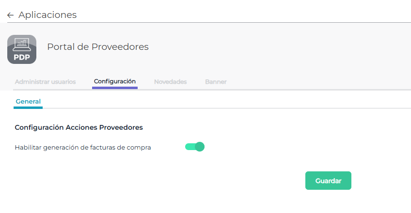 Podrás ver la siguiente pantalla de configuración, desde donde habilitar/deshabilitar la opción de que los proveedores puedan gestionar la carga de facturas en la aplicación: