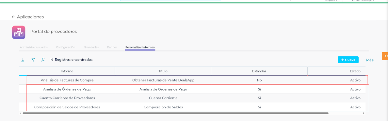 Puedes activarlos para que aparezcan en la página de inicio de la aplicación (desde la columna “estado” pueden cambiar el mismo de “inactivo” a “activo” o viceversa), o el usuario también puede agregar cualquier informe aquí.