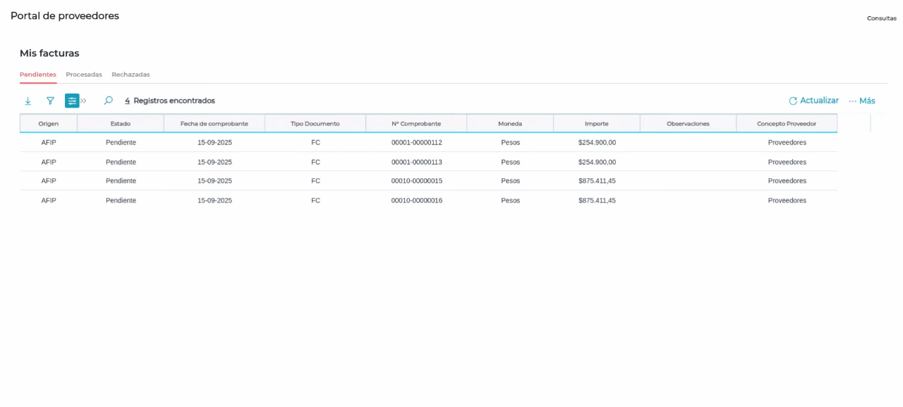 En los documentos de compra cargados desde el Portal de Proveedores, el campo “Fecha” se completa automáticamente con la fecha del día en que se registra la Factura de Compra, no puede ser modificado por el proveedor y se muestra en gris para indicar que está bloqueado. De esta manera, se garantiza que la fecha registrada coincida siempre con la fecha de carga del documento.