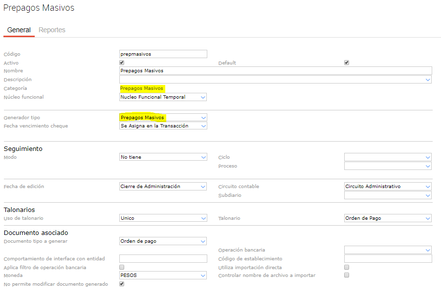Debe estar configurado de la siguiente manera. Es muy similar al proceso de Pagos Masivos, diferenciándose los selectores de “Categoría” y “Generador Tipo”, los cuales deben completarse con “Prepagos masivos”.