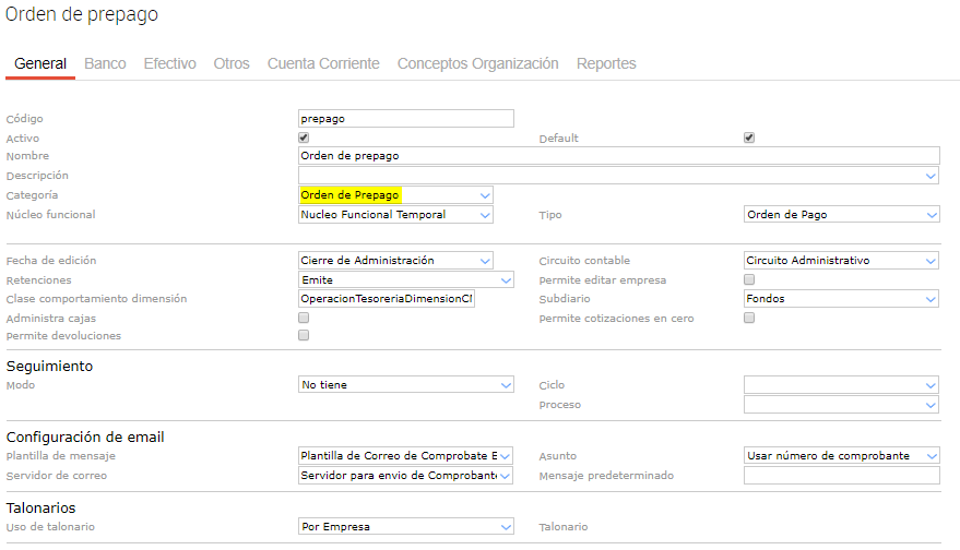 El tipo de documento de orden de prepago difiere del de la orden de pago en el selector de “Categoría”, la cual debe completarse como “Orden de Prepago”.