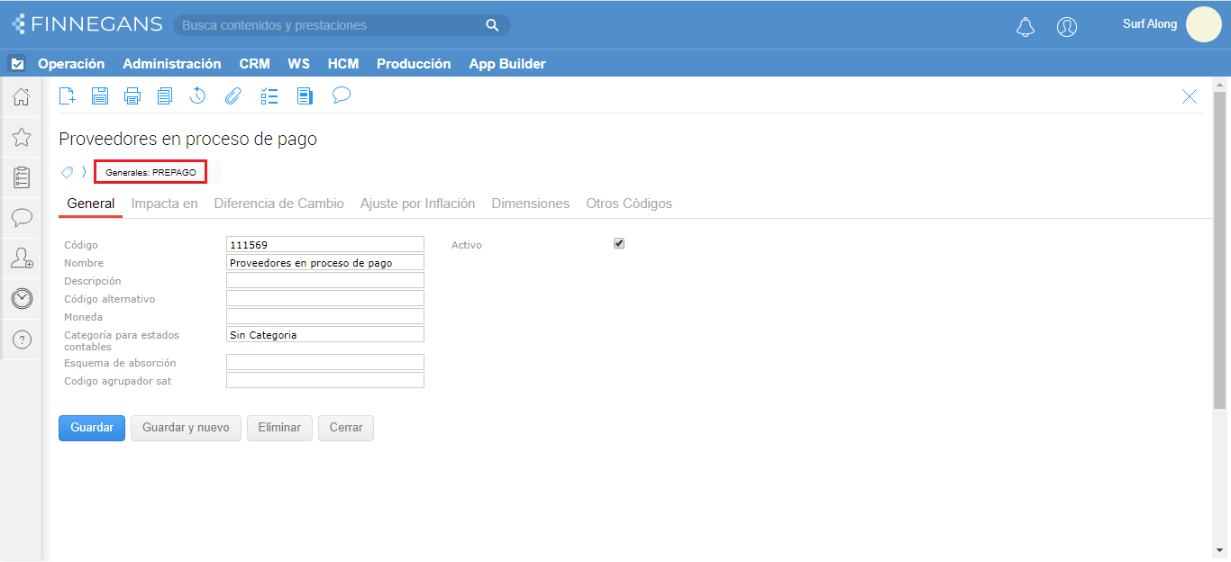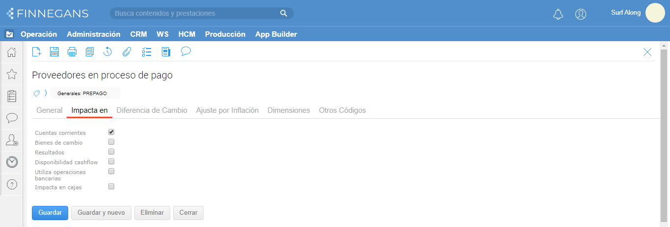 Es importante que esta cuenta puente tenga establecido el tag “PREPAGO” de tipo generales; esto permitirá que sea esta cuenta la que se utilice en las órdenes de prepago. Respecto de las restantes configuraciones, solo debe estar tildado el check de “cuentas corrientes” en la solapa “impacta en”; esta cuenta no genera diferencia de cambio ni ajuste por inflación.