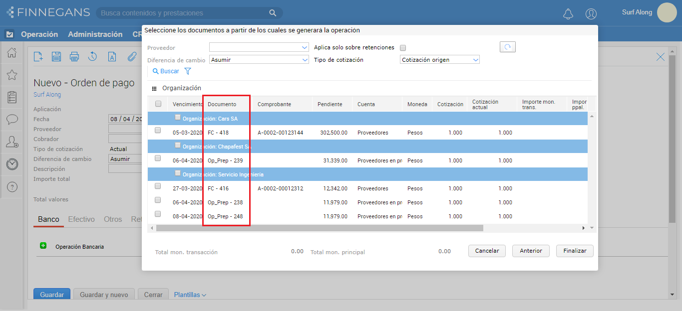 Desde los checks resaltados se pueden seleccionar independientemente cada uno de los documentos. Si un documento tiene más de un vencimiento, en esta vista se va a ver aperturado cada vencimiento del comprobante.