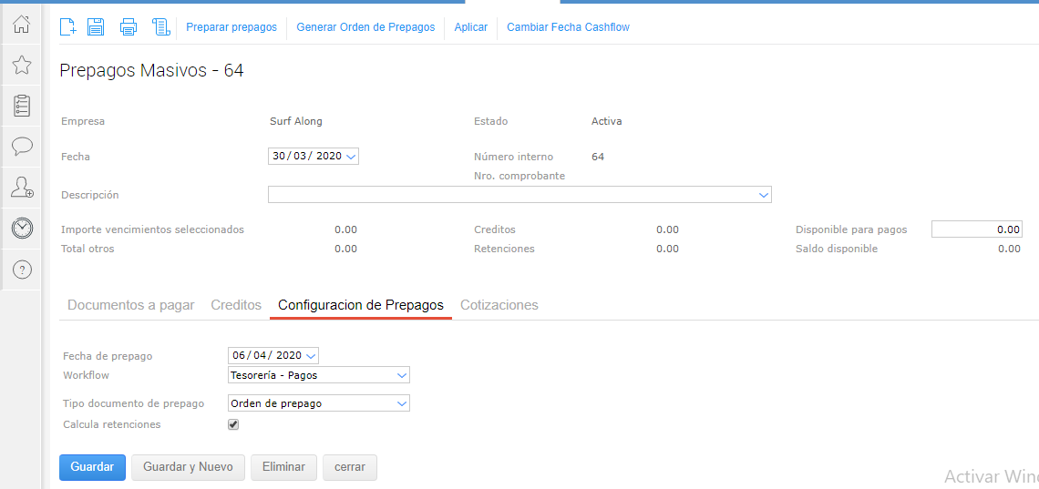 Desde el botón “nuevo”, generamos una nueva orden de prepago.