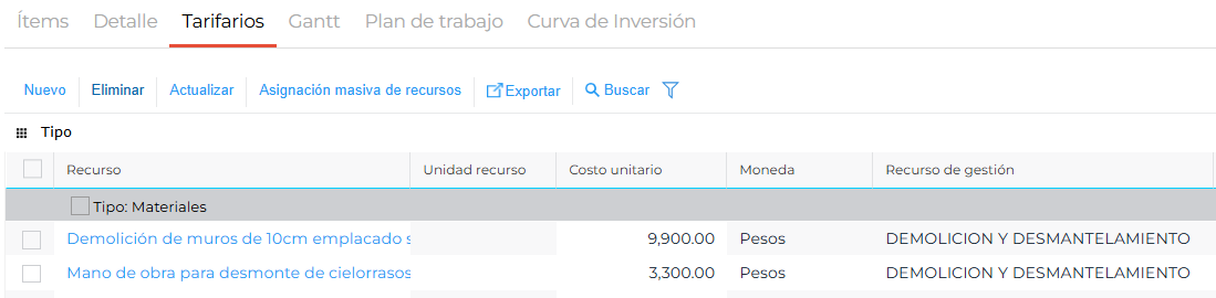 Por ejemplo: hay varios recursos diferentes que coinciden su recurso de gestión y tienen diferentes costos unitarios.