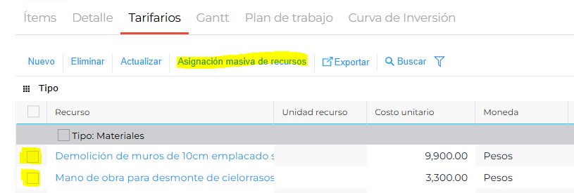 Elegir los recursos a modificar y seleccionar el botón “Asignación masiva de recursos”.