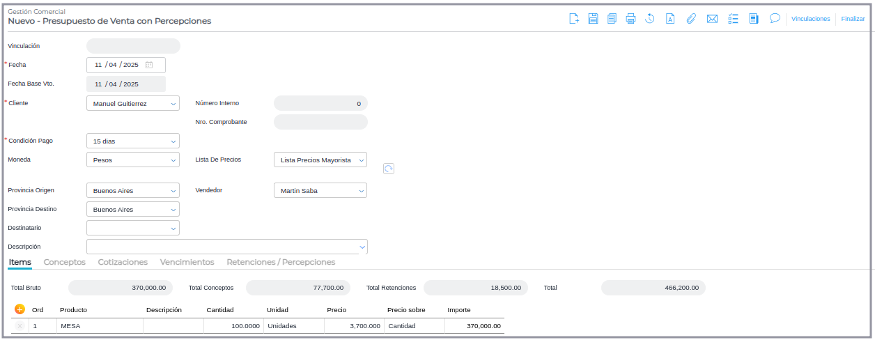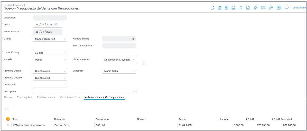 Tener en cuenta que para que se calculen automáticamente las percepciones, deben realizarse las configuraciones necesarias, para ello, puedes ver el siguiente instructivo Motor de Retenciones de IIBB - Configuración