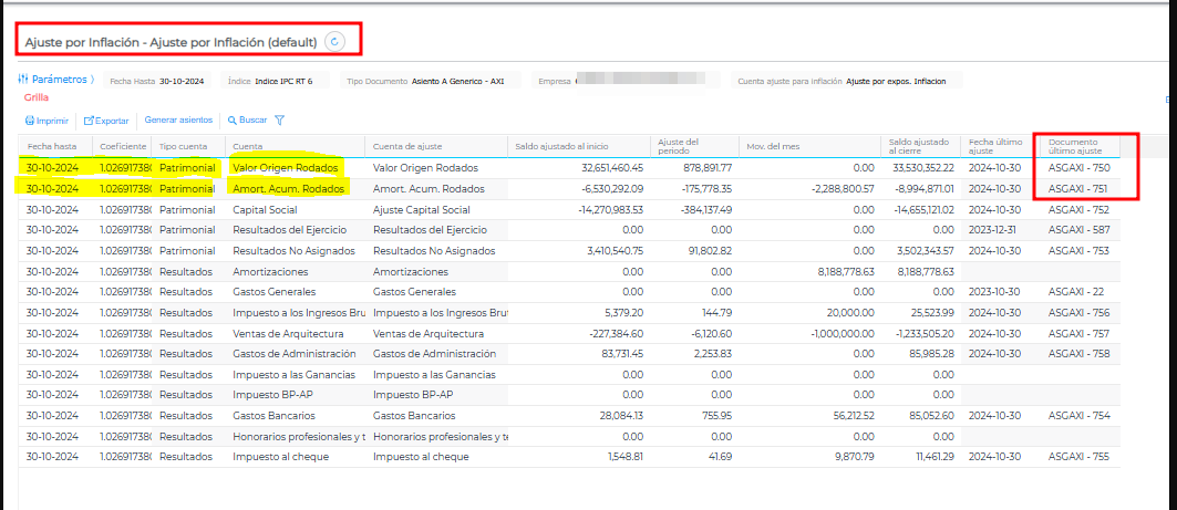 Se debe revisar la configuración de las cuentas contables y corroborar que no tengan el check “Genera Ajuste por Inflación”, ni la cuenta de ajuste.