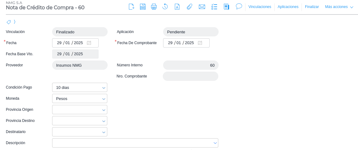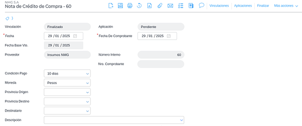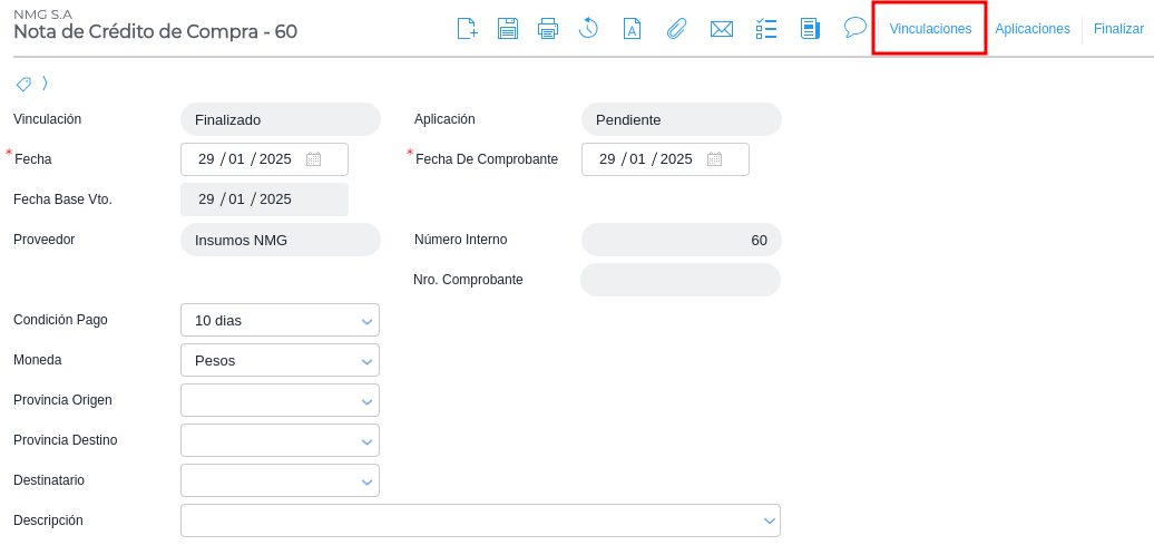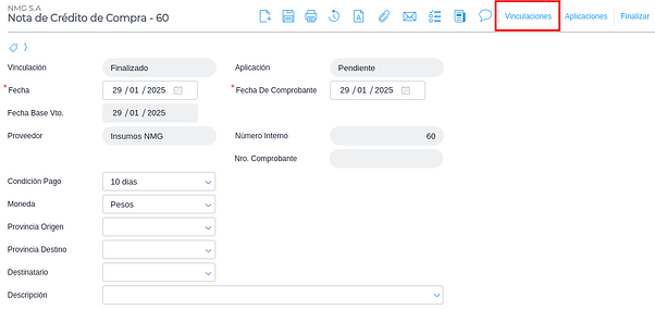 Para este ejemplo realizaremos el proceso de desvinculación de la nota de crédito de la factura de compra, para ello, desde la misma se presiona el botón “desvincular”: