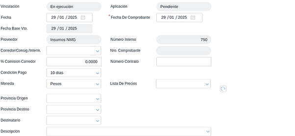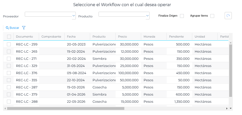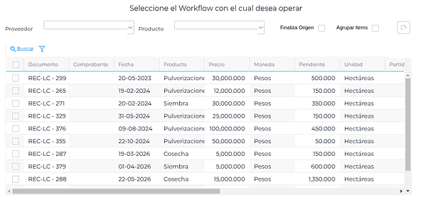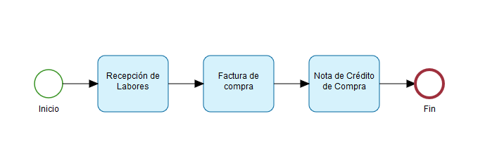 Como se ve en la imagen primero se genera la recepción de labores, como ya dijimos de manera asociada a un laboreo. Con la misma se da origen a la Factura de Compra, la cual puede ser el final del circuito o continuar hacia una Nota de Crédito de Compra.