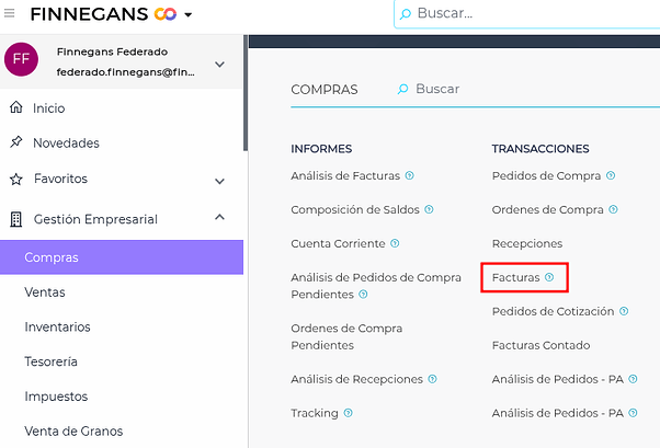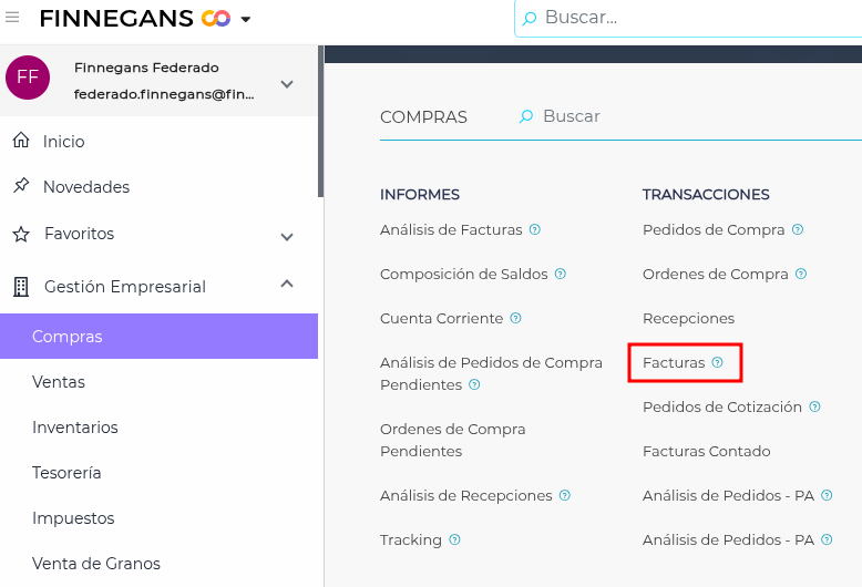 Para completar el circuito es necesario dar de alta una factura de compra que refleje el gasto. Esto se realiza desde Menú Desplegable → Gestión Empresarial → Compras → Facturas:
