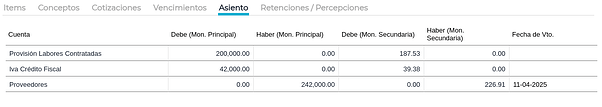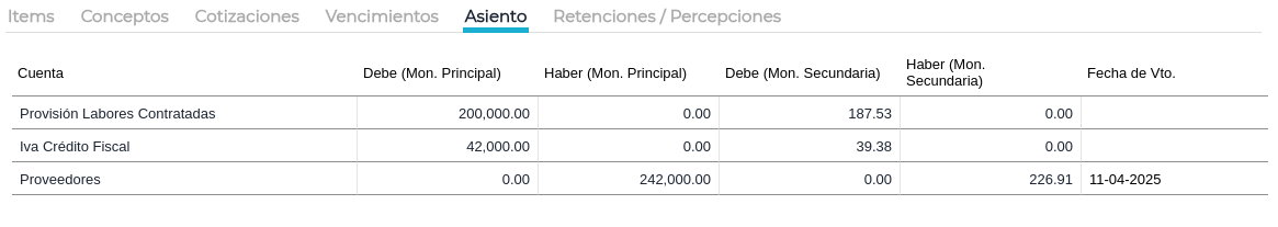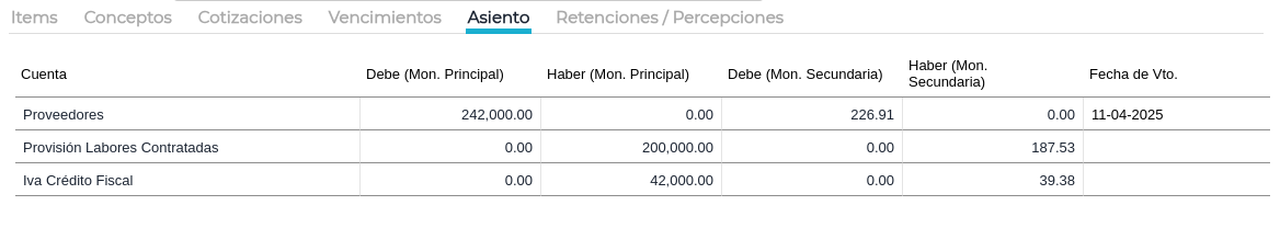 - cuenta puente Provisión Labores Contratadas (que se netea al cargar la factura del contratista)