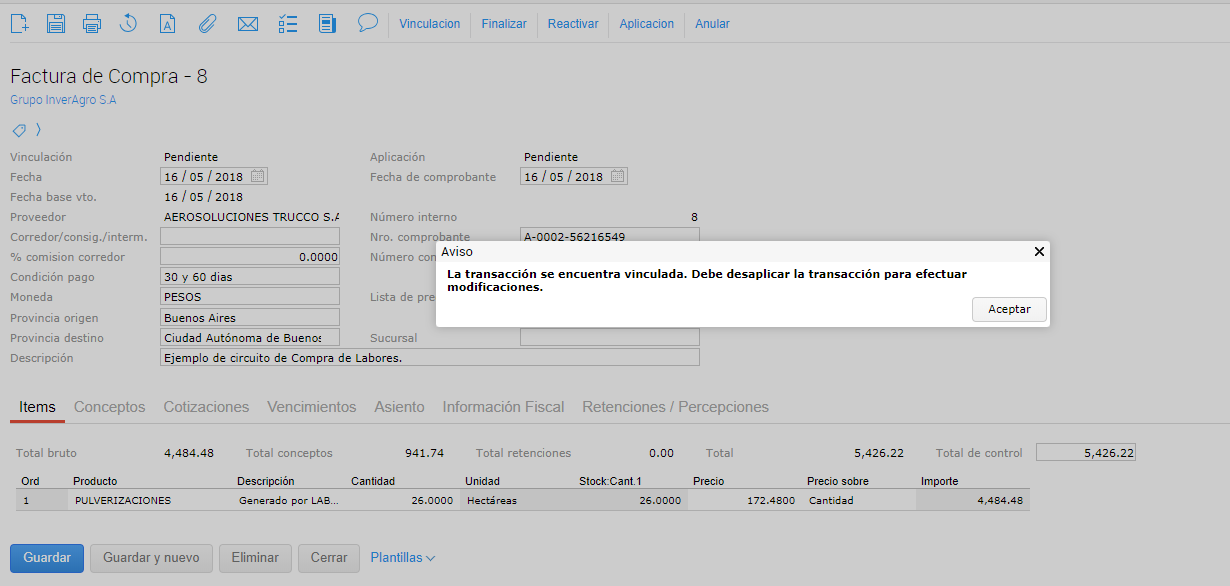 De ser necesario editar tanto la factura de compra como la nota de crédito se debe desvincular la transacción a editar de los pasos anteriores y posteriores. De no realizar este paso se presentará el siguiente mensaje: