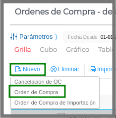 Para cargar una nueva Orden de Compra, se hace clic en el botón Nuevo.