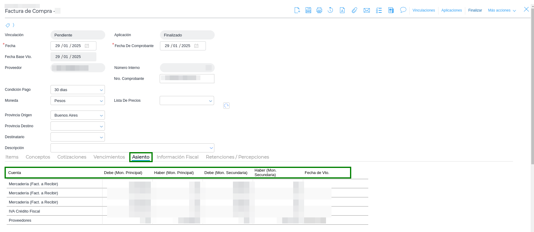 Al grabar la factura, el sistema realiza un asiento contable con las cuentas asociadas a la organización, los productos y los conceptos. El asiento se puede visualizar en la solapa Asiento dentro de la Factura de Compra previamente guardada o se ingresa a través del botón imprimir y eligiendo el formulario Asiento. También se puede acceder a través del Libro Mayor ubicado en Menú → Contabilidad → Informes → Libro Mayor.