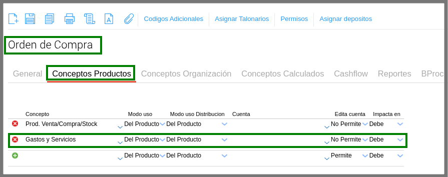 Los tipos de documento involucrados en este proceso, en Concepto Productos deben tener configurado el concepto “Gastos y Servicios”. Caso contrario, no se podrán cargar.