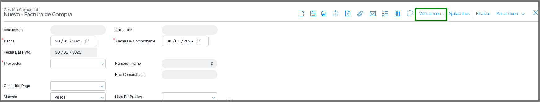 Ante esta situación se realiza la factura sin asistente y luego se vincula con la orden de compra a través del botón “Vinculaciones”.