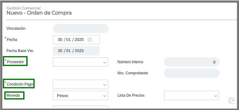 - Condición de pago: la condición de pago pautada con el proveedor. Existe un maestro de condiciones donde se dan de alta: Maestro de Condiciones de Pago.