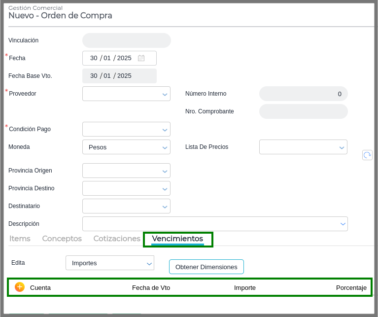 - Condición de pago: este dato se puede modificar y de él depende como se abren los montos de los vencimientos en la solapa Vencimientos.