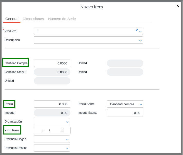 Por cada ítem, se registra la cantidad a comprar y el precio con el cual se realiza la compra. También existe la opción de ingresar una fecha de próximo paso para indicar cuando se necesita realizar la recepción, que debe ser posterior a la fecha de documento.