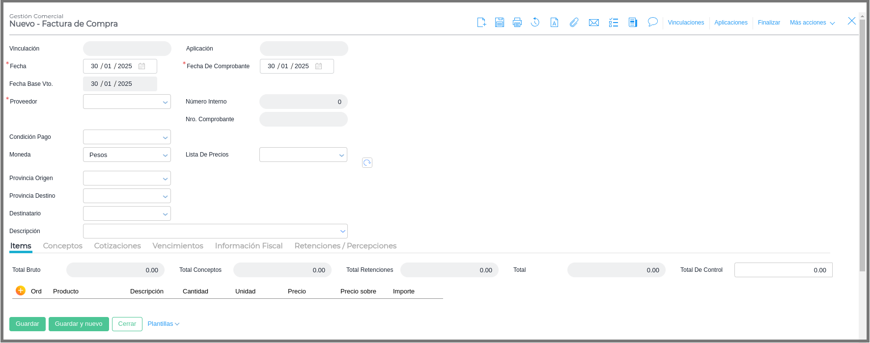 Si la transacción se realizó con asistente, la pantalla recuperará toda la información de las órdenes de compra que la precedieron, si se carga una factura de manera directa, se deben completar todos los datos necesarios para poder guardar la factura.