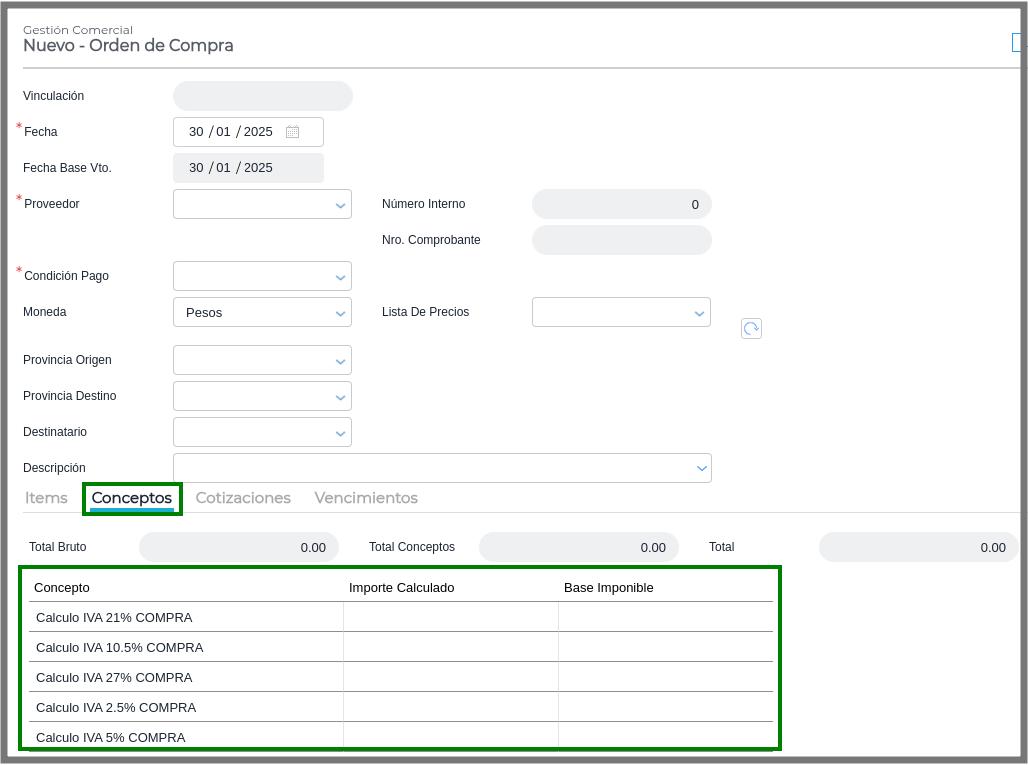 En la solapa Conceptos, el sistema dispone de una grilla para cargar los valores relacionados con los impuestos calculados en las facturas que vienen desde el proveedor como puede ser IVA, impuestos internos, entre otros.