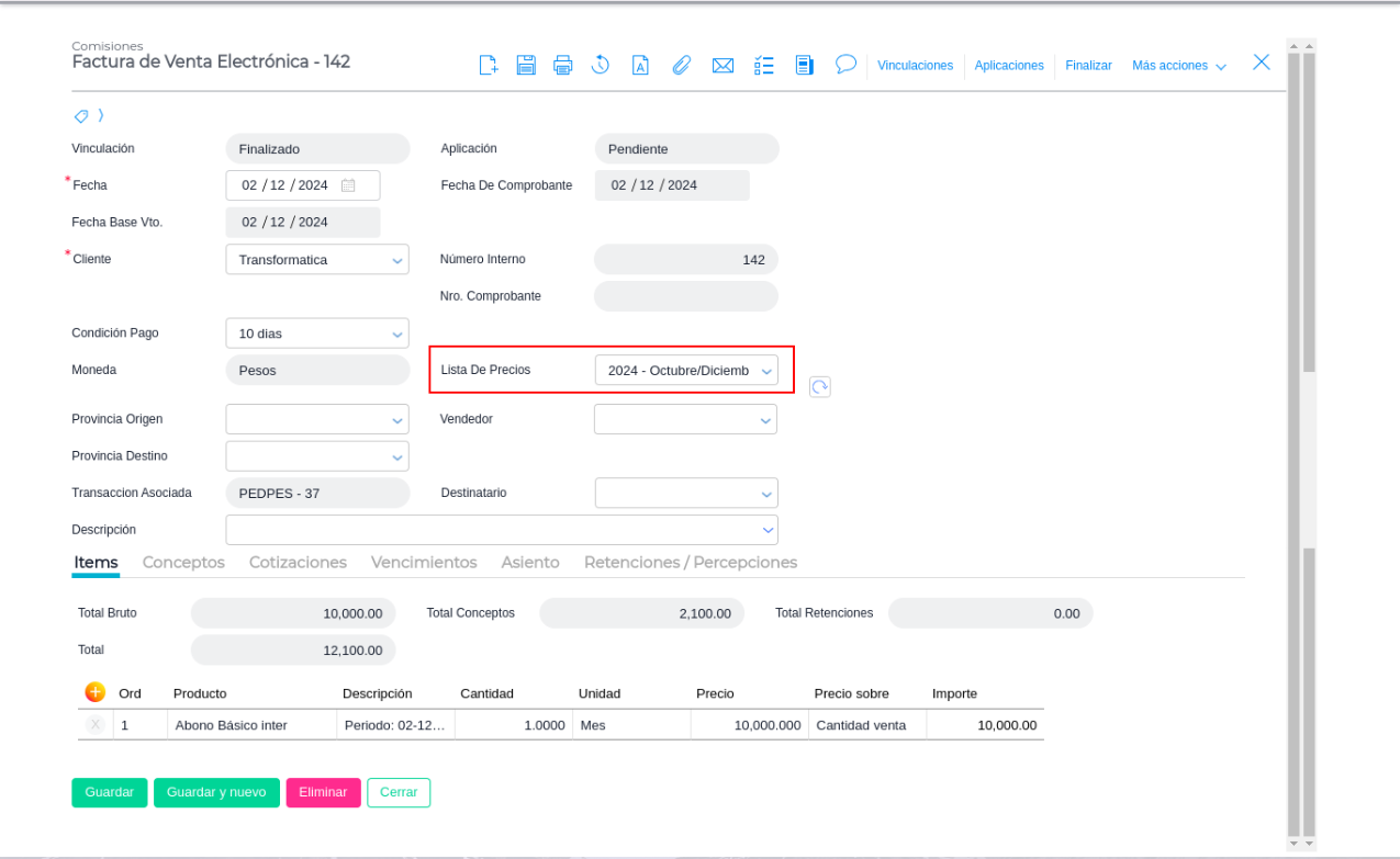 - Al generar la factura, la misma hereda el campo Lista de precios, de manera informativa.