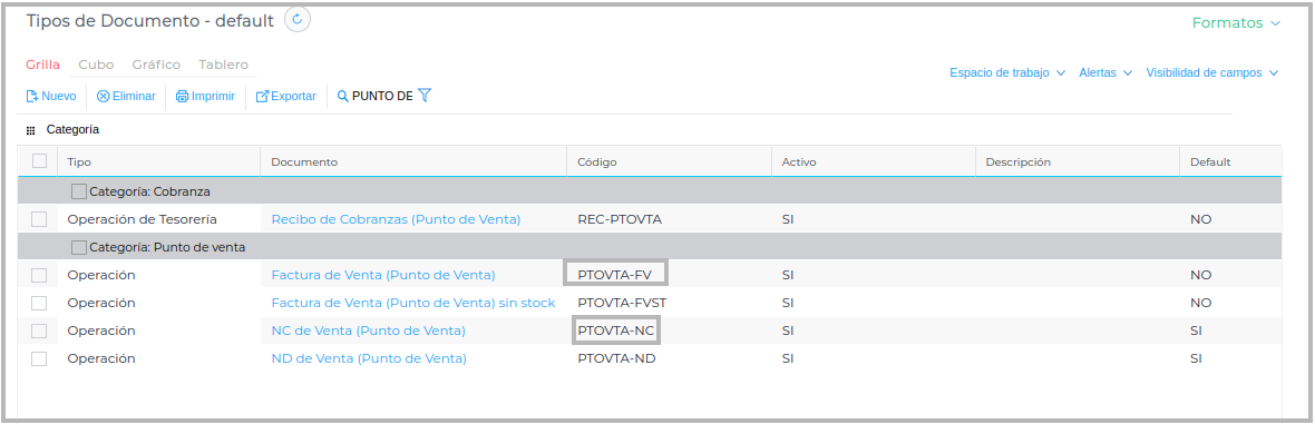 TIPODOCUMENTOFACTURANEGATIVOCODIGO: Se debe indicar el código de tipo de documento PTOVTA-NC