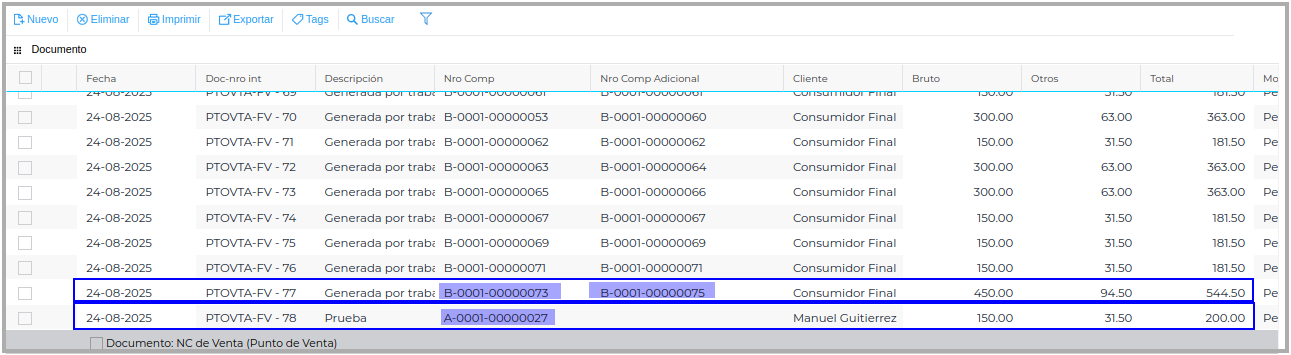 Para la categoría Fiscal Consumidor Final: Resume las ventas por producto y precio, y genera un único documento de punto de venta, agrupando esa información.