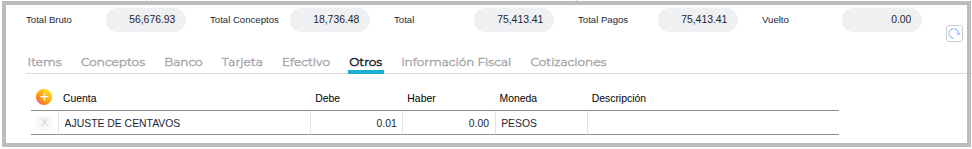 Esto va a permitir que ante diferencias de centavos, se cree en la solapa Otros una cuenta de ajuste que balance las diferencias entre el Total y el Total Pagos y evitar errores. Se debe configurar por cada sucursal.Particularmente se da cuando se Resumen una gran cantidad de ticket B en un único Punto de Venta.