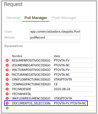 DOCUMENTOS_SELECCIONADOS: Es un parámetro opcional, el mismo permite indicar los códigos de los tipos de documento que se quiere filtrar, de forma de generar este proceso solo para esos documentos.
