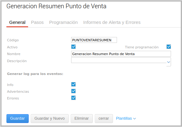 Ir a Menú – Configuración – Diseño de espacio de Trabajo – Trabajos. Una vez cargadas las operaciones del día en las tablas, se corre una vez al día el trabajo Generación Resumen Punto de Venta.