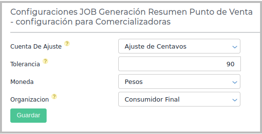 - Organización: Se debe indicar la organización para completar el ajuste, se recomienda que sea la organización default que se envíe para generar el resumen de punto de venta (Ticket B).