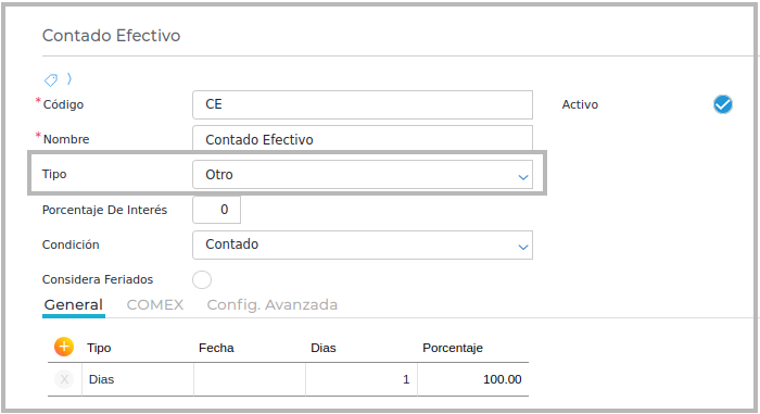 CONDICIONPAGOFACTURACODIGO: Se debe indicar un código de condición de pago, en este caso, CE (Contado Efectivo) como ejemplo, el mismo debe tener configurado el tipo = Otro, esto va a permitir visualizar todas las formas de pagos en la consulta de Punto de Venta.