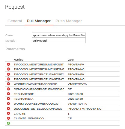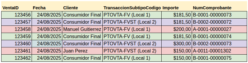 Se puede observar que las ventas Id 123457, 123460 y 123461, cuyo código de tipo de documento es PTOVTA-FVST, no se deberán procesar en este trabajo, ya que no esta definido en el parámetro “DOCUMENTOS_SELECCIONADOS”.