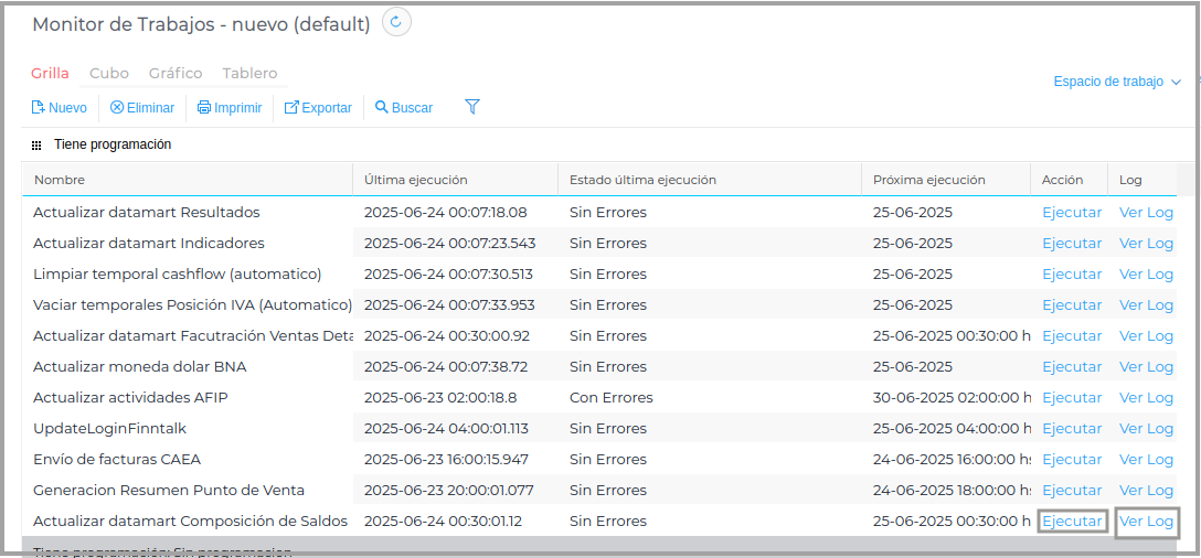 Ir a Menú – Configuración – Diseño de espacio de Trabajo – Monitor de Trabajos. Se podrá visualizar la última vez que se ejecutó el trabajo e indicando la próxima hora de ejecución.