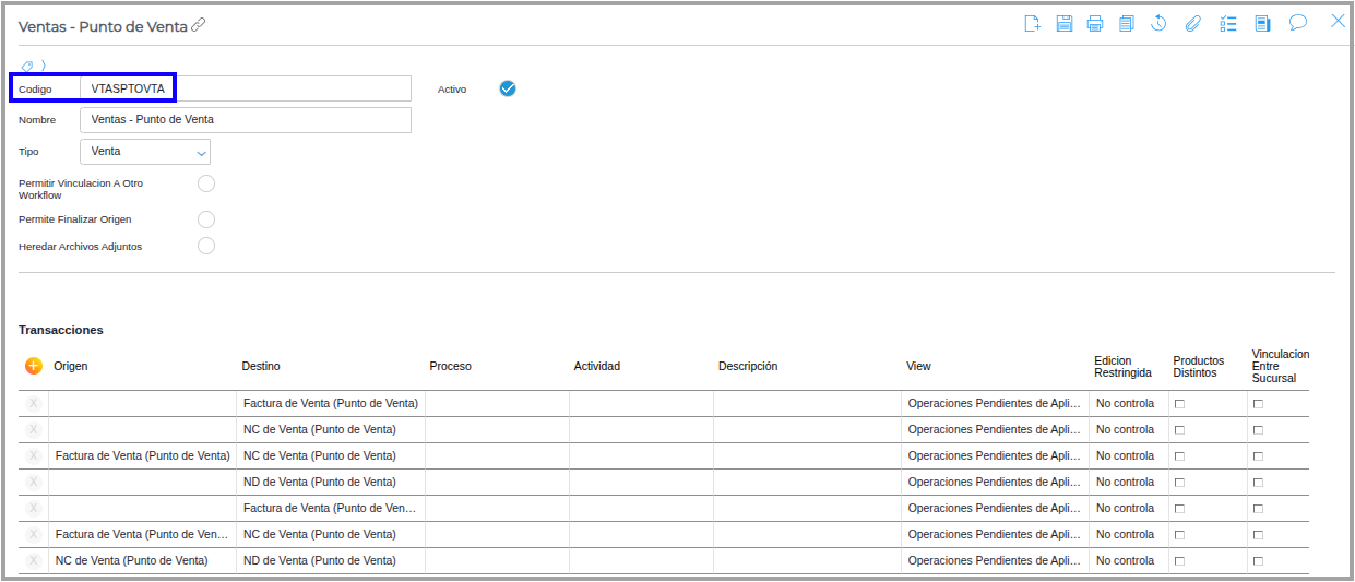 WORKFLOWRESUMENCODIGO: Se debe indicar el código de workflow del Punto de Venta VTASPTOVTA