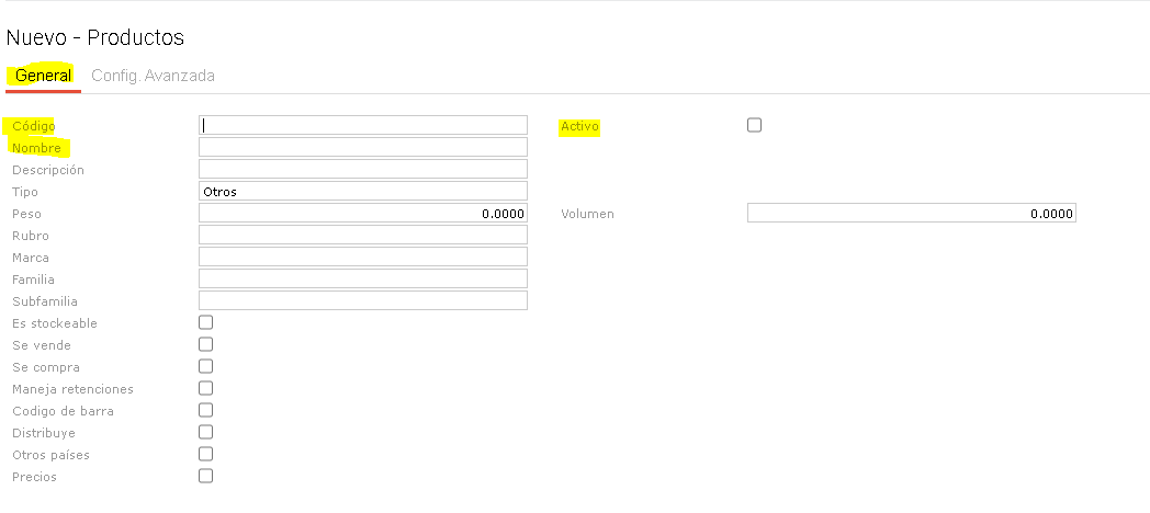 2- Completar en la solapa general los campos: Código, check Activo, Nombre y marcar los checks de “Se vende”, “Se compra”, “Es stockeable”, entre otros según corresponda por la naturaleza del producto.