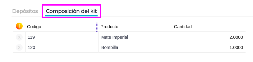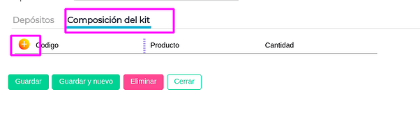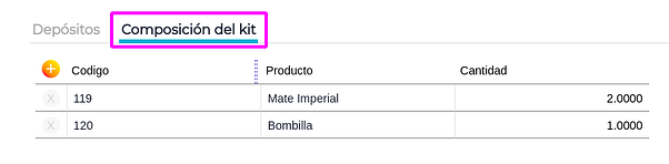 - Luego, vamos al final de la hoja de la solapa de “Stock” y completamos los productos que van a componer ese KIT. Para ello vamos a la solapa “Composición del kit” y seleccionamos la opción de “+” (más).